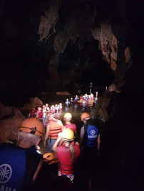 יש חליפות הצלה וקסדות עם פנסים ושוחים למערה. הולכים בערך קמ אחד מתוך שישה. ומגיעים גם לבריכת בוץ.